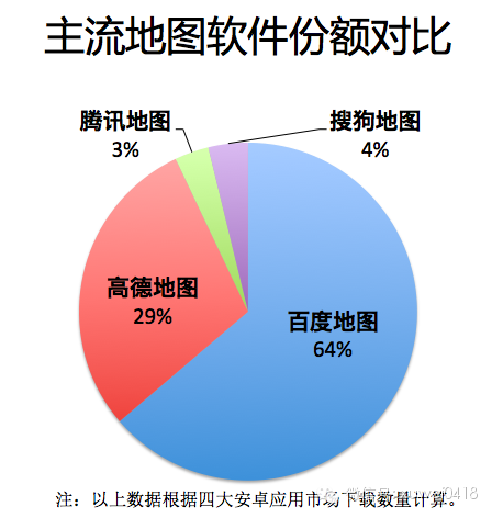 通过统计百度手机助手、360手机助手、豌豆荚和应用宝4家最主流的安卓应用商店当中地图软件的下载数量,我们可以粗略的看出这个市场的格局:百度地图占到6成的市场份额遥遥领先,高德地图占3成市场份额稳居第二,腾讯地图、搜狗地图等其他地图软件总共占据剩余的1成份额,对前两名基本上形成不了威胁。