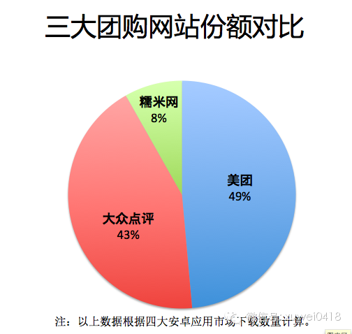 接下来我还统计了4家主流应用商店当中,代表身后的BAT出战的三大团购网站的下载数量,单就这三家对比来看:美团相当于是大众点评和糯米团的总和,占了49%,大众点评实力也不俗,占到43%,剩下可怜的8%留给了百度的糯米团。