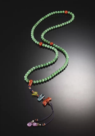 翡翠材质,108粒数珠,珠体均匀饱满,光泽明丽,细腻温润,富有生气,配有四粒珊瑚隔珠,下接珊瑚佛头,以大粒珍珠、黄色碧玺,蓝色碧玺及珊瑚、珍珠米珠为结珠,其间饰有珊瑚雕牌,后以粉色碧玺为坠角。整器色彩艳泽,材美艺精,保存良好,包浆润泽自然,手感柔滑。乃随身礼佛、驱秽辟邪之佳品。