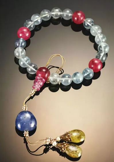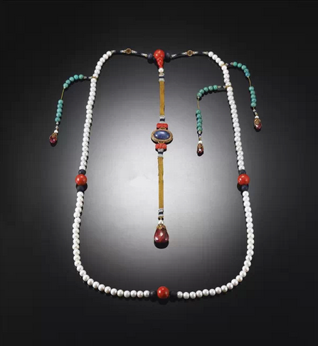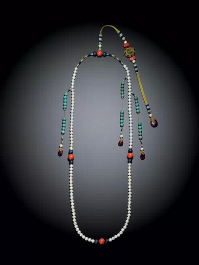 由较为常见的108颗子珠组成的上品挂珠发展而来的朝珠,是清代宫廷服饰的标准佩戴品。在北京故宫博物院所收藏的清代帝后朝服像中可以看到,努尔哈赤、皇太极和顺治帝没有佩戴朝珠,但顺治帝的皇后却佩戴了朝珠。顺治帝的母亲孝庄文皇后在晚年朝服像中也佩戴了朝珠。自康熙帝以后,历代帝后的朝服像显示均佩戴有朝珠。