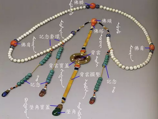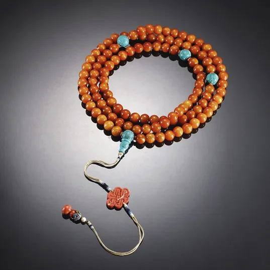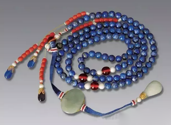 朝珠是清朝皇帝和官员着礼服(朝服、衰服)、吉服(龙袍) 和常服时佩戴的一种装饰物,挂在颈项垂于胸前,是显示身份和地位高低的重要标志之一。朝珠的主体自108颗珠贯穿而成,材质多种多样,有珠石、木质和角牙质等,多为贵重材料。