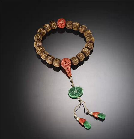 系用伽南香打磨成珠,通体雕刻一“寿”字,后镶以金粟,其工作量比普通伽南串珠多数倍。迦南香之古朴与金粟之辉煌交相辉映,华美而不失质朴。珊瑚结珠、佛头、佛塔。佛头内中空,透雕云纹,刀法圆润,线条浑厚,富有立体感。佛塔葫芦状,颈部云纹上线刻“寿”字,坠饰晶莹,起地透雕龙作“S”状,饰以云纹,动感十足,中部刻“寿”字。佛塔顶部、玉佩顶部及底部、坠角顶部均缀以束状珍珠,每束十粒左右。此手串应为皇室成员祝寿时所赠礼物,雕琢一丝不苟,独具匠心,其精美的材料和高超的工艺体现着主人的身份与地位。