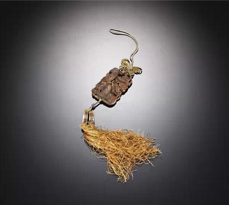 质感温润,富有光泽,为上等伽楠香而制。形状扁平,刻枝叶茂密,缨蔓勾连,质感强烈,呼之欲出。枝叶掩映处结有两只葫芦,造型拙朴,刻“大”、“吉”二字,甚为可爱。牌的边缘为自然交错而出,打磨光滑。牌的顶部及底部缀有缨络装饰。是件刀工娴熟,线条富有弹性,构图设计和画面层次都独具匠心,典雅大方,高贵而不失质朴。