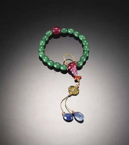 蓝宝石晶莹明亮,工艺细致,琢制精心。“佛头”、“佛塔”由红色碧玺珠制成,下端有白色米珠结,一浅黄色绦带穿蓝宝石背云,绦带下端以黄色碧玺为两坠角。是款手串材质极为珍贵,晶莹透彻,明洁无瑕,浓艳华美,令人惊叹。