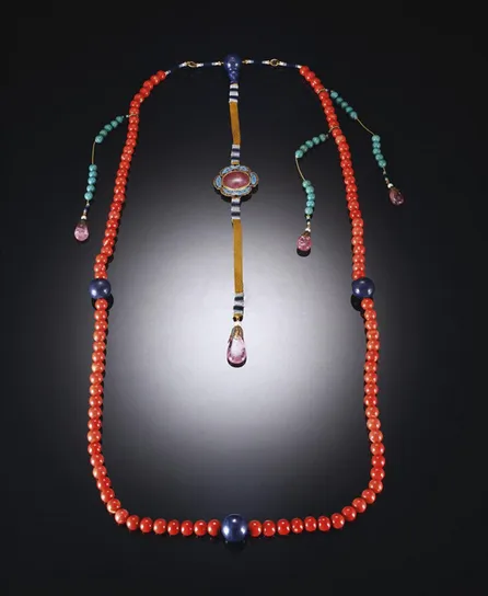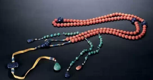珊瑚珠108颗,青金石结珠、佛头、佛塔,黄绦系银镀金点翠背云,嵌红宝石,碧玺坠角。绿松石纪念三串,碧玺坠角。按清《会典》规定,自皇帝、后妃到文官五品、武官四品以上,方可配挂朝珠。此件朝珠所选珊瑚珠一百零八颗大小如一,颜色鲜艳,圆润而有光泽,是按12各月,24各节气,72侯,为一年的说法,总数定为108颗。