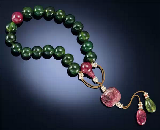 碧玺取材颜色极品,乃碧玺中最尊贵之双桃红,粉艳浓郁。翡翠隔珠、佛头,配有盘长纹翡翠牌及坠角,大粒珍珠及珊瑚、珍珠米珠为饰。此串取材精美,通身色泽浓艳,璀璨夺目。明艳动人,琢磨油润,配色富丽不失典雅,造型细腻而无损大气,乃万中挑一之珍品。