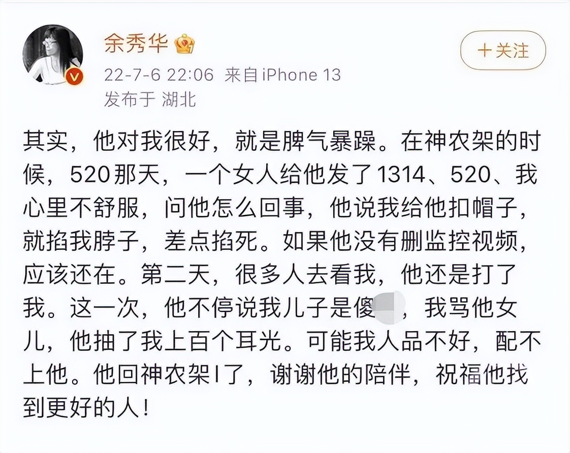 因为,7月6日(昨天)晚上,余秀华在其微博发文称:其实,他对我很好,就是脾气暴躁。在神农架的时候,520那天,一个女人给他发了1314、520、我心里不舒服,问他怎么回事,他说我给他扣帽子,就掐我脖子,差点掐死。如果他没有删监控视频。应该还在。第二天,很多人去看我,他还是打了我。这一次,他不停说我儿子是傻X,我骂他女儿,他抽了我上百个耳光。可能我人品不好,配不上他。他回神农架了,谢谢他的陪伴,祝福他找到更好的!