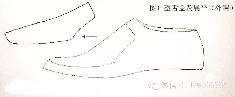 同样,这也是一种产生的误差难以掌握,需要试帮并反复修整的方法。处理的结果是背中线长度不变,轮廓线长度缩短。如果背中线弯曲程度越大,轮廓线长度缩短就会越大,很难修整。因此,这种方法适用于横条舌式鞋靴的短围盖取跷,而对于整体舌式鞋靴的整舌盖是不适用的。