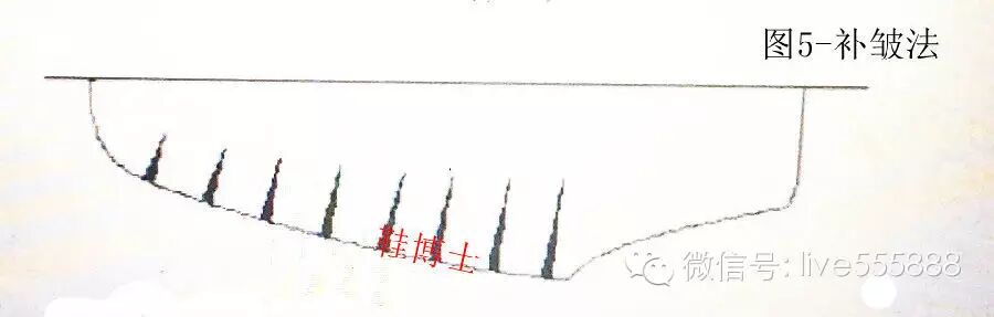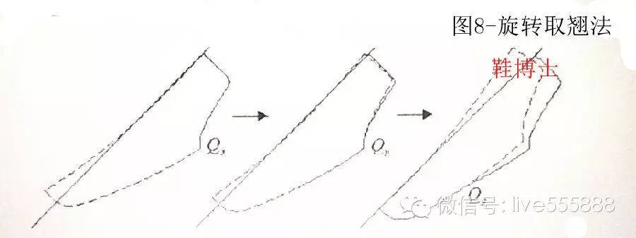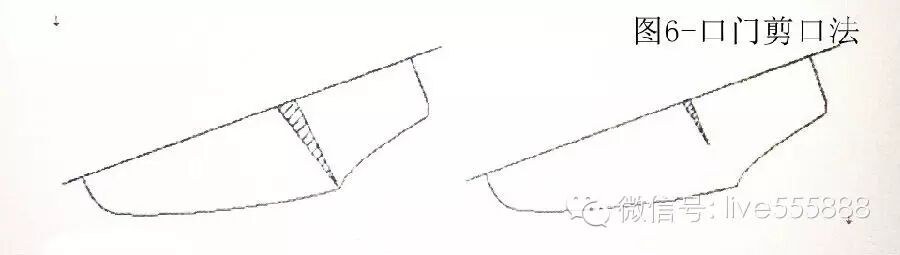 过比较我们可以清楚地看到:①轮廓线褶皱法(或称轮廓线鱼刺法)与旋转取跷法中以背中线旋转一样;②口门剪口法中剪口深度为全部口门宽度时与旋转取跷法中