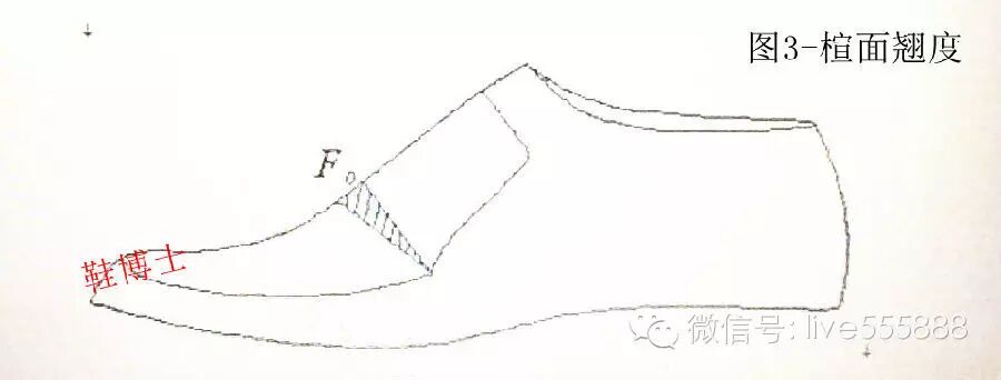 若 从力的转换角度来分析,贴楦时,从平面到曲面,在跖趾部位F0处有一种张力,或者说撕裂力,须将纸张撕裂,即加入一个三角形的跷度才能贴平服(图3)。展 平时,从曲面到平面,跖趾部位F0处纸张的变化情况正好相反,有一种压缩力,或者说内聚的应力,纸张须起皱,即减去一个大小相同的三角形跷度才能展平。显 然,贴楦和展平是一对逆变换。