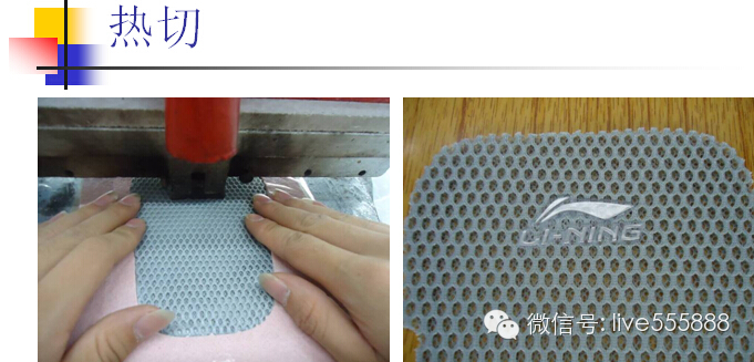 到切割的作用,使塑料熔化后与鞋帮亲和,冷却后即能粘在鞋帮上,达到焊接的目的。热切工艺表现出来的是凸凹花纹的变化与滴塑片相似,但是比滴塑工艺的成本