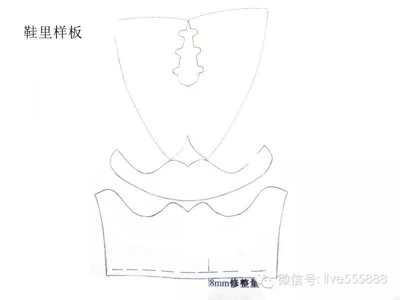 鞋 里样板包括前帮里、翻口里、领口泡棉,见图710。其中的翻口里部件,底口要加放sm修整量,用来弥补领口泡棉厚度所需要的加工量。装配明织带时,先把织 带的一段按规定位置与鞋里车好,然后按照应留的长度在把织带反折回去,再车第二道线,织带与鞋里固定后再与帮面合缝,就不会受到干扰。要求强度较高时,车 织带的缝合线不少于三道