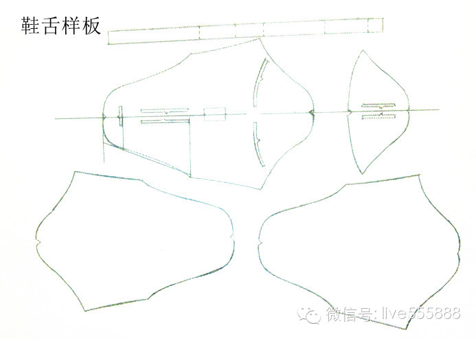 鞋舌样板包括舌面、舌里、舌泡棉、装饰片以及织带。帮面板上有加工标记。注意织带在鞋舌上面有一个穿鞋带的拱起量在4mm左右,控制加工标记长16mm,该位置的织带长20mm,织带宽度选用12m规格。