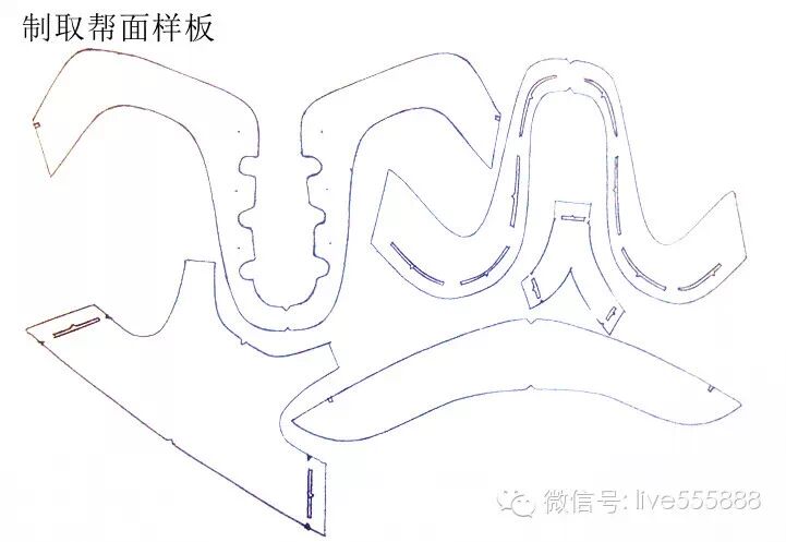 在帮面板上,里外怀共用一件折中板, 也叫设计板,包括了里外怀总合后的最大面积,里外怀的接帮点也相同:在楦底板上,经过了补差法处理,里怀前掌边沿去掉面板上里怀多出的量,外怀腰窝边沿去掉面板外怀多出的量。把接帮的标记点刻出
