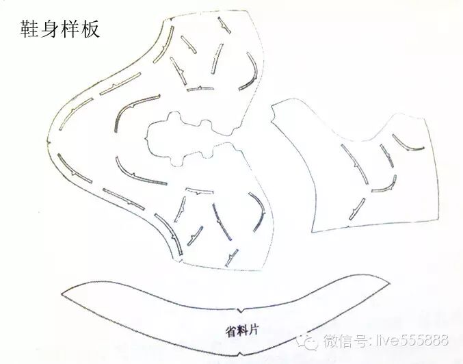 鞋身样板包括前鞋身、后鞋身以及前鞋身的省料片,标出加工标记.