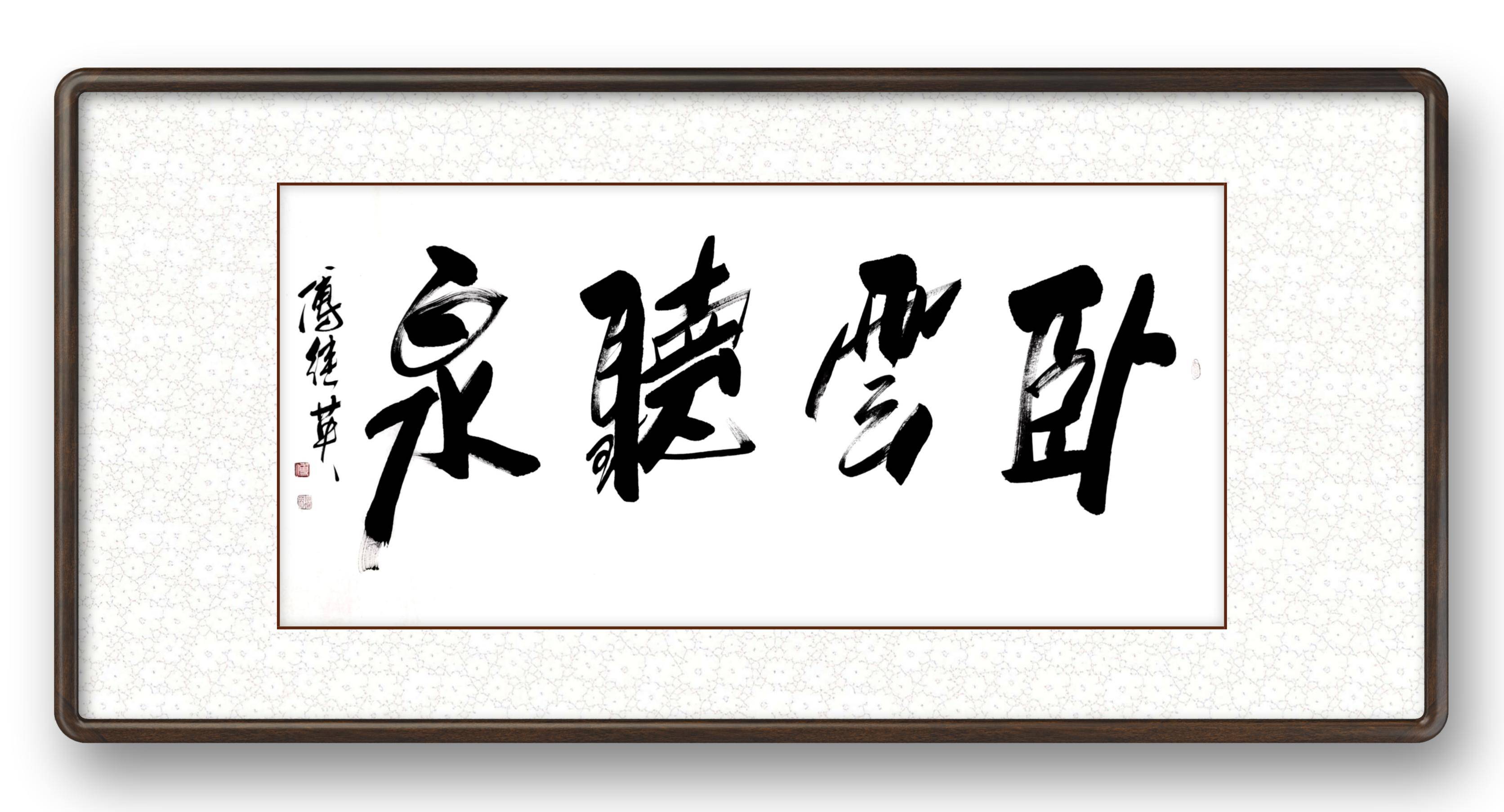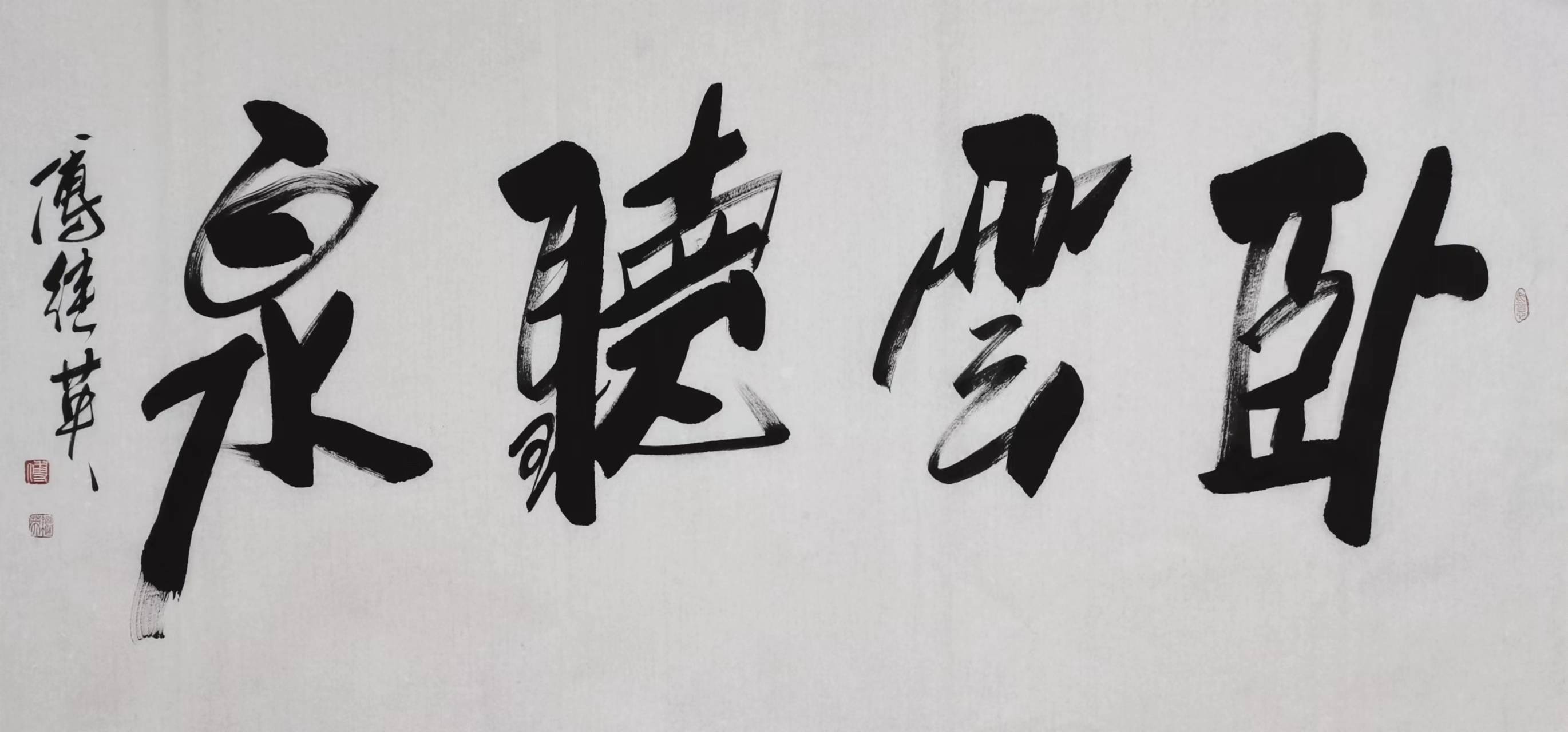 傅继英书法:卧云听泉。意思是隐居在山中的隐者,睡在白云底下,看天上的白云悠悠,听着泉水的声音,形容一种特别悠闲惬意的生活方式。