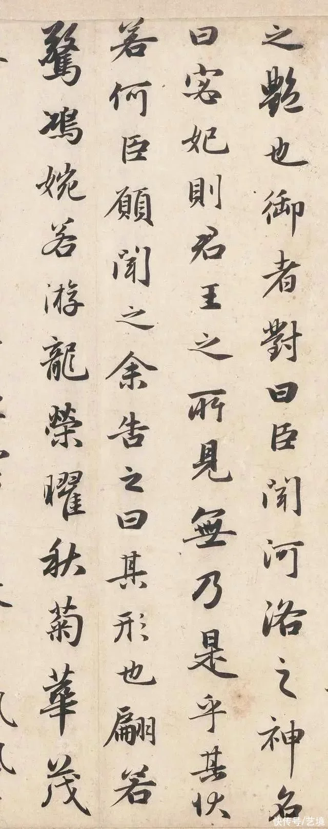 从这个角度来讲,赵子昂是有实力媲美王羲之的。赵子昂的这件行书《洛神赋》每一个字单独拎出来都是千古不易的经典范字,堪称行书领域的“教科书”,在此基础之上,再去深入晋唐,你就能够具备了深厚的基本功,再去学习其他的法帖,就能够从容不迫而游刃有余了。