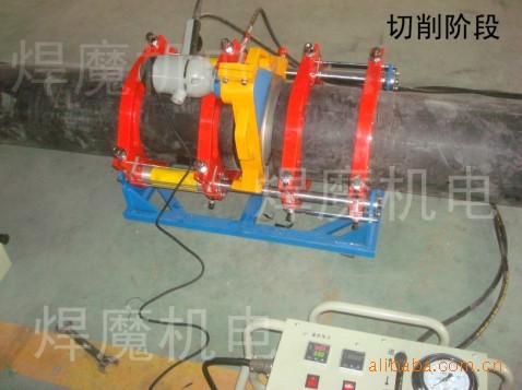 焊魔牌热熔对接机无论是手动型,还是液压型,加热板和铣刀是必配的,不同的是前者依靠人工操控,后者由液压系统提供动力,实现半自动控制,尤其对于口径较大的管道,在铣、加热和冷却时都需要很大的压力,人力一般很难做到。整个对接过程大致可以分为:放、铣、热、冷几个步骤,下面用图片的方式给大家演示下: