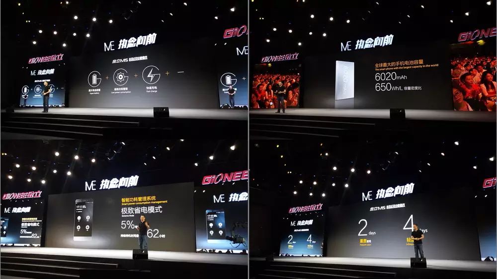 然而,金立也清楚并不是单纯靠增大电池容量就能解决续航问题。于是他们采用了双电池模块设计把单块容量控制在3千毫安以策安全;他们采用了极速快充技术使得手机充电几分钟而获得长达几小时通话的能力;他们还通过软硬件手段对耗电因素进行研究和干涉,最终使得这部手机达到”重度使用续航2天、轻度使用续航4天“的记录!