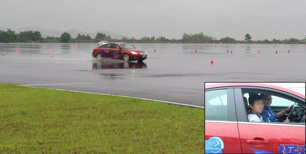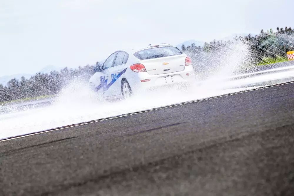 通用方面还安排我们上车进行了两场特别的试驾:先是驾驶一辆科鲁兹在用瓷砖和玄武岩铺设的低附着系数道路上体验一下在冰雪路面上行驶的感受。要知道这段路面平时还需要喷水以降低地面的摩擦系数,而昨天因为天降大雨所以倒是省却了这个地步——整个路面几乎光滑到连走路都会摔跤,而我却要开着科鲁兹以高速通过路面,同时还必须猛打方向盘与拉手刹!毫无悬念的,第一次通过时我的科鲁兹几乎是以90°度横向的侧滑过半个试验场,手忙脚乱了好一阵子才恢复对车的控制。好在随车的试驾员教练指点我如何把握拉手刹与打方向盘的节奏,并指点我连续快速的左右打方向盘以矫正车辆在侧滑时的姿态。大约的确是因为人的潜力无穷,第二次通过这个光滑的低附着系数路面时,我居然很快的控制住了车身侧滑,并在很短时间里矫正了方向盘的侧倾,连教练也给出了“开得非常好”的评价。