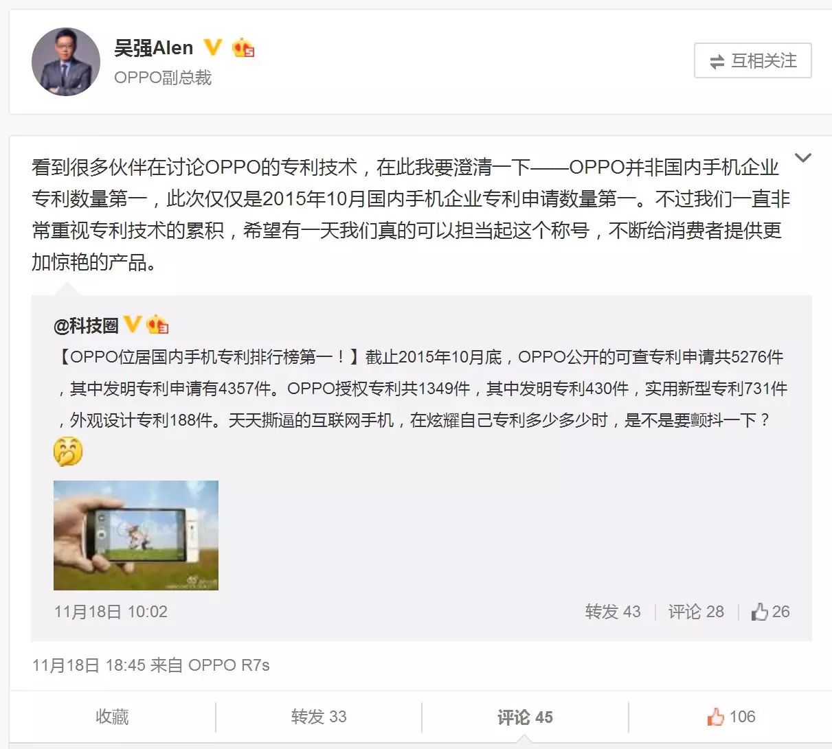 无独有偶,在市场上OPPO R7全系列手机热销的同时我们也听到有消费者质疑为什么OPPO手机的价格普遍要比其他国产手机价格高。我不禁想到上个月看到OPPO副总裁 @吴强Alen 发的一条微博。这条微博是Alen为账号@科技圈 的一条有关“OPPO位居国内手机专利排行第一”的微博做注解,说这个“第一”只是针对2015年10月而言的,不过OP