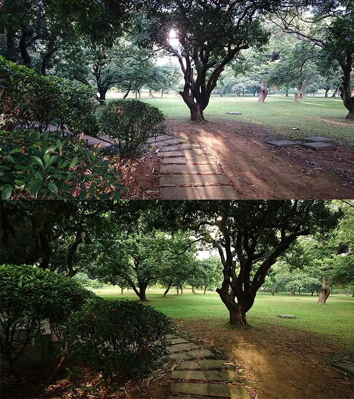 此外,本机的自动白平衡表现也比预想的好。下图中上面这张图片是自动白平衡,较好的还原了清晨树林里略略偏高的色温。下面这张图则是同一场景下选择手动模式,选用晴天白平衡后对色温做了一点降低后的效果。前者更符合当时的实际环境,后者色彩则显得更厚重一些,大家觉得那个更好?