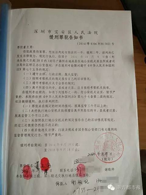 11月14日的下午,董王勇通过缓刑罪犯告知书上的号码,联系上谢祝妃。本来毫无头绪的董王勇,从谢祝妃口中得知是深圳龙华新区油松派出所办的案。