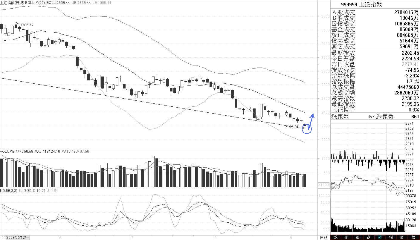 直接向下大幅下探2150点,考验楔型下轨,形成阶段性低点!因为这是多方最后一道防线,如果有利好政策支持的话,2150的支撑力度不容忽视,特别是在目前市场极度看空的情况之下!如果出现这种走势,短线投资者在2150点附近择机进入!