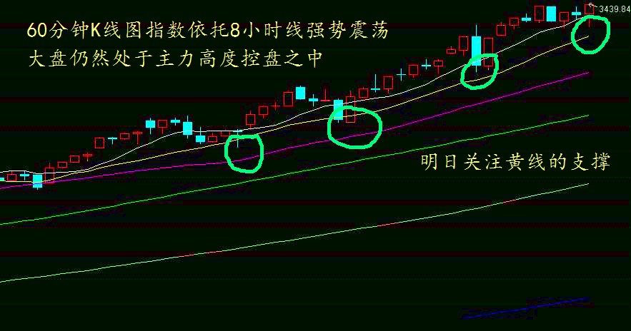 技术上指数依托60分钟线8小时稳健向上运行,今日大盘的下影线盘中“吃掉”了昨日阳线的涨幅,收盘价收阳表明主力还是通过红盘维系市场人气及信心,同时也使得5日乖离率得到较大的修复。这个8小时向上通道是否能够保持下去呢?首先:中石油及中石化短线有利空将会产生震荡走势;中国建筑的开盘价如果过高又会影响到大盘的稳定,所以明日确实对于大盘是一个考验!我想明日盘中仍然有一个下探3400点的动作,而明日5日均线上移到3410一带,所以明日的看点应该是:5日线+中国建筑开盘价+中石油的反映!