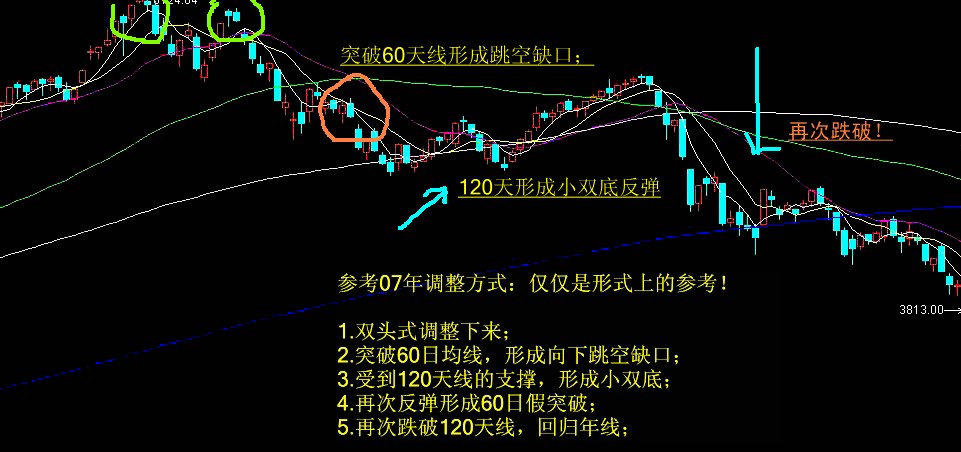 目前的调整与6124点开始的调整有些相似,现在用图来分析,借鉴一下,并非是6124点的克隆!因为目前的各种环境与07年6124点还有很大的不同。所以形式上的借鉴不要引起误解,因为市场的走势是千变万化的,如果环境因素变化则120天也有成为底部的可能性!抛砖引玉,仅此而以!
