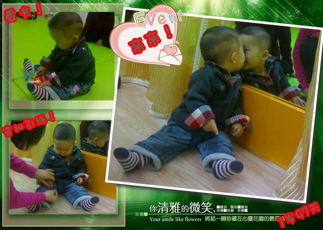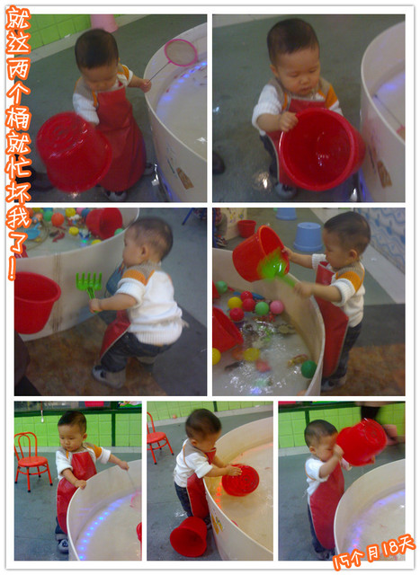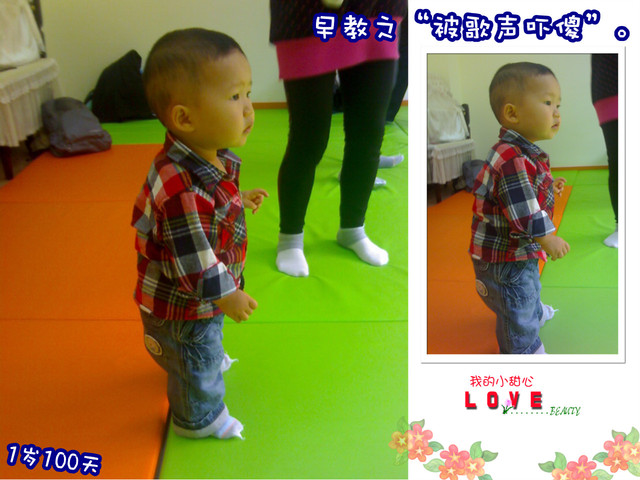 溜宝在早教中心表现得也还可以,开始不愿意进“教室”作测评,后来,老师给抱进去也让了,也没哭。到新环境,一如以往,要站一会儿,不走,要熟悉一会儿才迈步。很喜欢那里的球、镜子,很害怕那里的橡皮娃娃(长得是挺丑的,有点儿吓人)。想做什么就站在那里指,并“嗯嗯”地让大人帮他去做,这样不好,我一两个月前就发现他这点了,那天老师也提出来了,应该让他的第一反应是自己解决问题。还不会认自己身上的部位,这个好像有点儿落后了,我们都教过他,他好像对这个非常“不感冒”,从来不理。串珠子很棒,说是达到了十八九个月宝宝的水平——会把小棍儿穿过珠子,但不会倒手去拿串过珠子的另一端小棍儿。