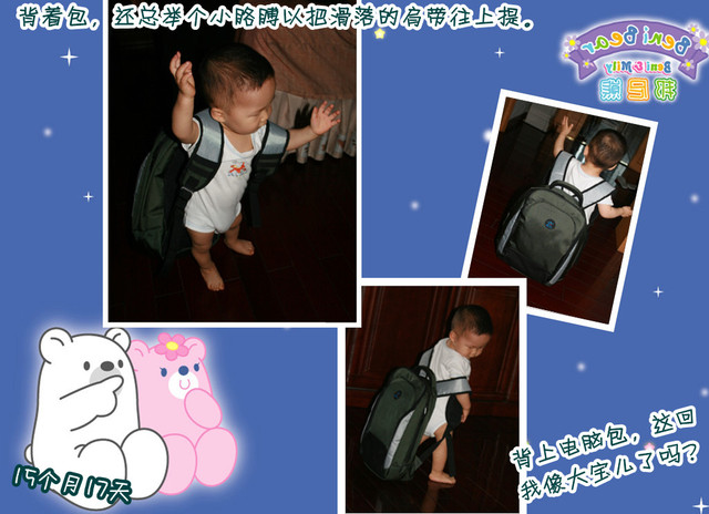 这段时间欠的博文太多了,溜宝现在都18个半月了,我给他15-16个月(此篇)、16-17个月、17-18个月的小结都没有写呢,还有一篇游台湾攻略,真不知道猴年马月才能补上。台湾攻略好说,关键是溜宝的小结,他在火速成长中,而我也在伴随着他的成长连轴忙碌中,“耕耘博客”的脚步完全跟不上他成长的速度,急人哪!记录溜宝的成长我是不会半途而废的,无论阻力有多大,欠了3篇,我也要一篇一篇地补上,因为真是觉得这些记录太珍贵了。他现在所处的阶段是每天都在变化,过去了就忘记了(反正记性不好的我是这样的),再回头想,也许只能想起来一两三件事,很可惜。但是回头一看记录的内容,很多场面就都浮现在眼前了,包括那时每个家庭成员的状态,那是一种很温馨、很快乐的感觉。现在就絮叨絮叨溜宝15-16个月的小进步吧。