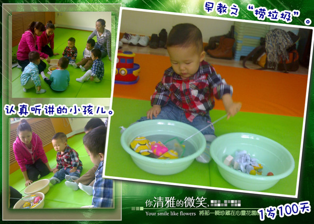 第一个游戏溜宝的表现真的令我很惊诧。是老师演示:把各种颜色的皱纹纸撕成小条条,然后一个一个地塞进空矿泉水瓶子里。溜宝认认真真地看着老师做,那小样子太可爱了!然后,老师就给每个小朋友都发了一个空矿泉水瓶和皱纹纸。我一句话都没有说,一根手指头都没有动,就想看溜宝怎么做。我真是没有想到,溜宝拿过来皱纹纸就撕,然后就往瓶子里塞……他居然真的记住了老师的一系列动作,然后自己模仿来做。他跟其他比他大八九个月的小哥哥的区别就是,人家撕纸撕得很细,条状很规整,溜宝就是乱撕,撕出的形状不规则;人家撕完往瓶子里装,并试图把所有纸都撕完装进去,而溜宝撕完装进去一些后,又都倒出来了。
