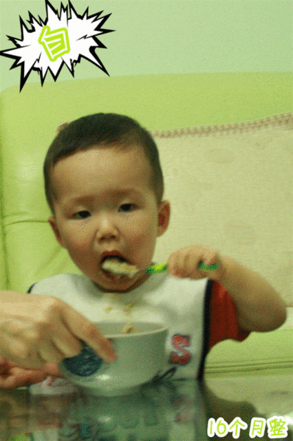 也就两三天的样子,溜宝自己吃饭就有准儿了,进步很快,自己拿着勺子基本上能喂进自己的嘴里了,也不怎么祸害了,吃得很带劲儿!我一表扬他,他还要放下勺子为自己鼓掌一下。再后来,溜宝吃饭就越来越讲究了,自己拿着勺子吃还不说吧,自己还知道吹,吹完了还用舌头尖儿小心翼翼地舔一舔,然后再放嘴里,可像样儿了!溜宝这小肚子一天吃得鼓鼓的。太上食了,特别爱吃饭,都探不着底儿,每次都喂到大人不敢喂了为止。真是不知道他饱没饱、几分饱,反正肚子圆圆的、大大的。