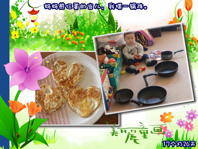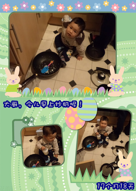 我做饭,溜宝就在厨房玩,把大勺、二勺、大锅、小锅都倒腾到地上,再把自己喝剩下的奶往大勺、二勺里面倒,然后自己又跑到屋里把自己的一个玩具小铲儿拿过来,开始学着我的样子“炒奶”……过一会儿,又从柜子里倒腾出一个塑料空杯,学着往锅里倒水的样子,倒,完了“炒”!