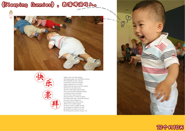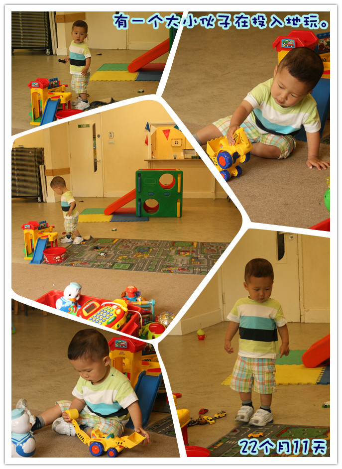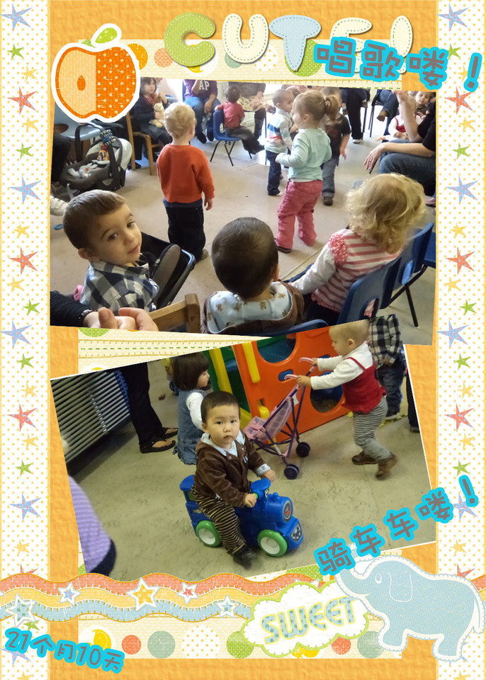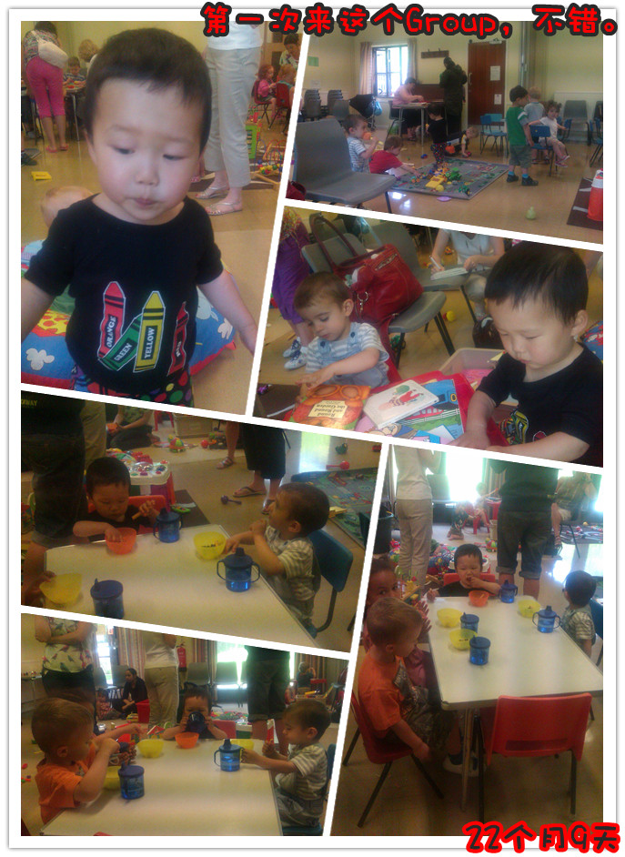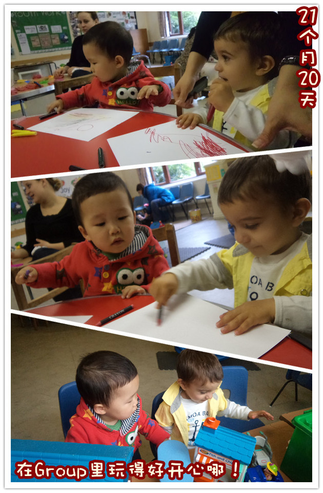 group”(婴幼儿活动小组)吧,真的会让一个人带孩子的妈妈轻松不少,也让孩子在成长过程中受益匪浅。现在,我和溜宝白天的生活特别规律,周一到周五每天上午10点左右都去不同的Group玩,玩到近12点,回家,吃午饭,饭毕,睡一下午觉。因为上午溜宝玩得很High、很透,下午一般都睡2—4个小时,这样,一天就基本上Over了。