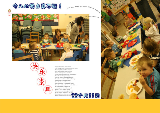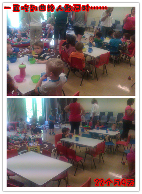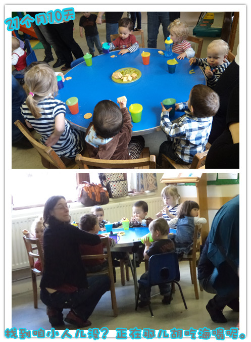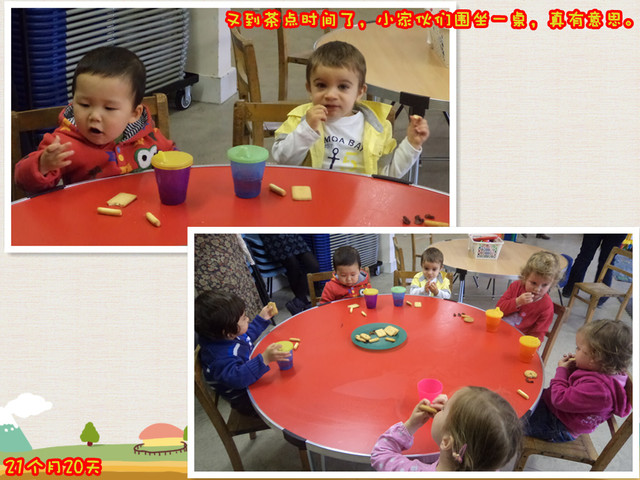 搬到这个新家R镇,感觉R镇的Group跟我们上一个家所在的B村Group的最大区别就是,R镇的Group的茶点时间单独隆重地“提”出来。即,孩子们先玩,大人们也不能喝茶,等“茶点时间”到,小孩儿们才能围坐一桌,一个个正巴经儿地坐在那里喝果汁、吃点心。大人们在这个时候也可以要杯茶或咖啡,吃点儿饼干点心了,很惬意的感觉。我想可能我们R镇的孩子比较少吧,都坐下来也没几桌,而B村的孩子比较多,要是都坐下来,恐怕桌椅都不够用了。