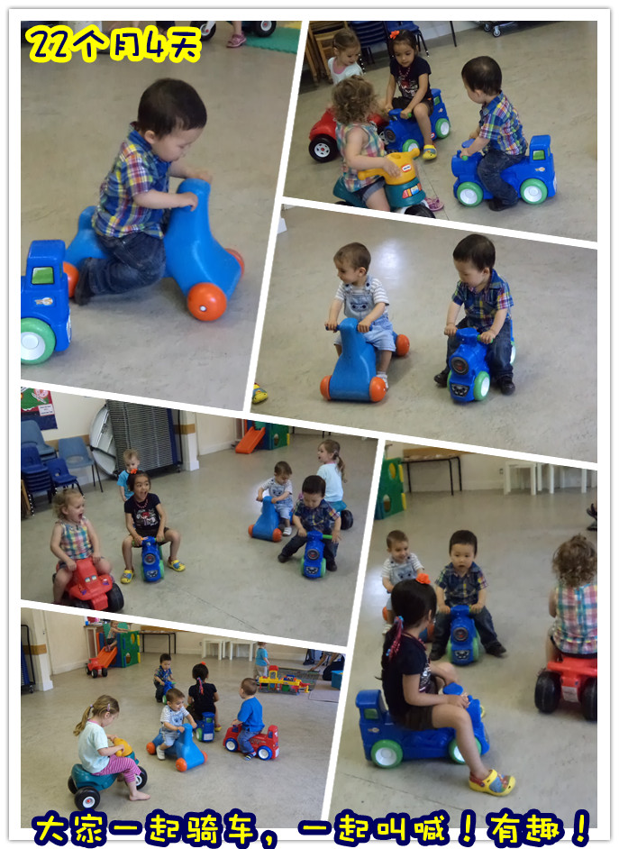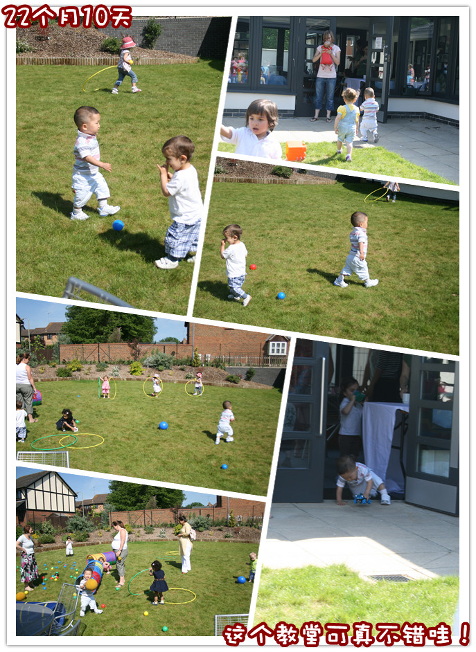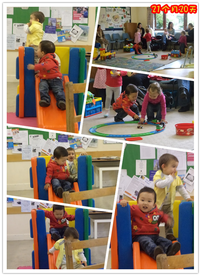 当然,在Group里面玩,小朋友们也会感觉到像在幼儿园、学校里的“生态”,比如,被欺负、受冷落、被赞扬、受鼓舞等等,还要学会跟比自己大和比自己小、野蛮和温柔的各种小朋友相处,我想这对小孩子来说也是一种锻炼吧。在Group里面,经常可以看到有的英国妈妈背着刚出生三四周的老二,领着老大去玩,溜宝特爱蹲在旁边看小宝宝,叫人家“宝贝”!
