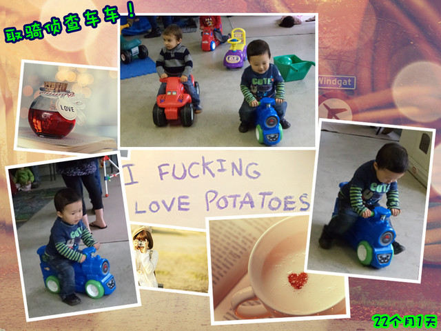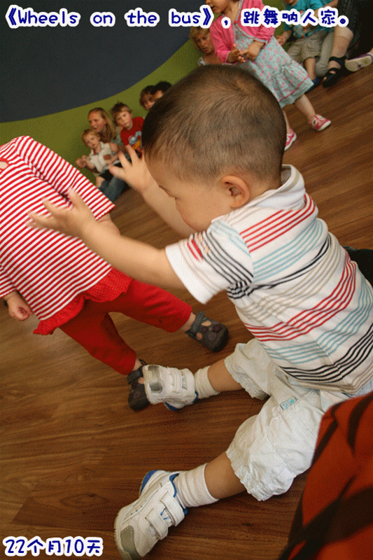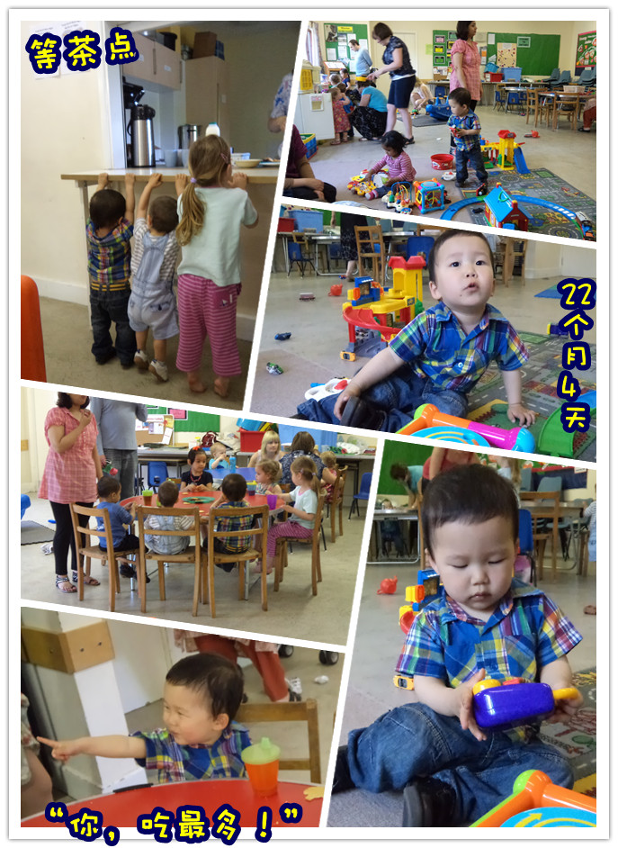 溜宝特喜欢来Group玩,一进去就把我忘得一干二净,玩这玩那,可忙活了。一到茶点时间,溜宝总是第一个坐上去,最后一个撤下来,尽显贪吃本性。唱儿歌的时候,溜宝越来越会跟着歌曲做动作了,像做太极似的,可好玩了。来到R镇的Group,我们还交到了一对国际友人——保加利亚母子(Neli和Daniel),溜宝跟比他大三个月的Daniel(我在日记叫他“大牛”)玩得特别好,小哥俩很投缘,第一次见面就玩得特别开心。现在我们每天Group完,都或者去我家或者去大牛家继续玩,然后吃午饭,这样,两个孩子可以多疯一会儿,疯够了再各自回家睡下午觉,感觉这样孩子们一上午玩得特别充分、特别透彻、特别开心。
