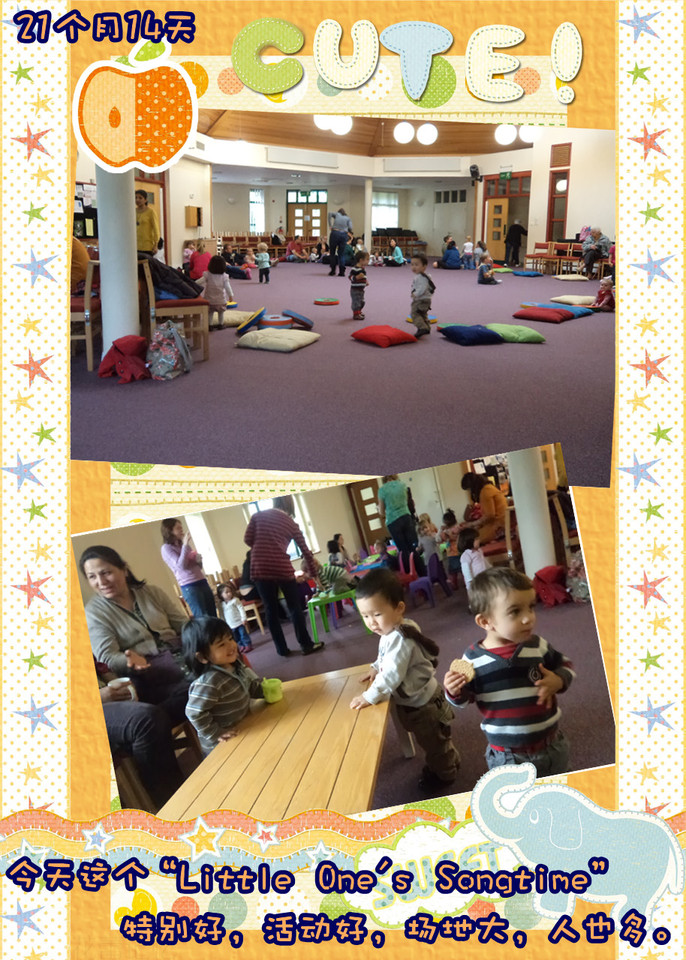 Songtime”(宝宝唱歌时间)。这个活动举办得特别好,场地很大,去的大人孩子很多,大家席地而坐,围成一大圈,礼堂里用大音箱放着儿童歌曲,宝宝和家长们跟着唱,小朋友们在中间跳哇、笑哇……唱大概半个小时,喝茶吃点心,小朋友们围坐一长桌,吃吃喝喝,大人们坐在周围喝茶聊天。1镑(人民币10元)一次。