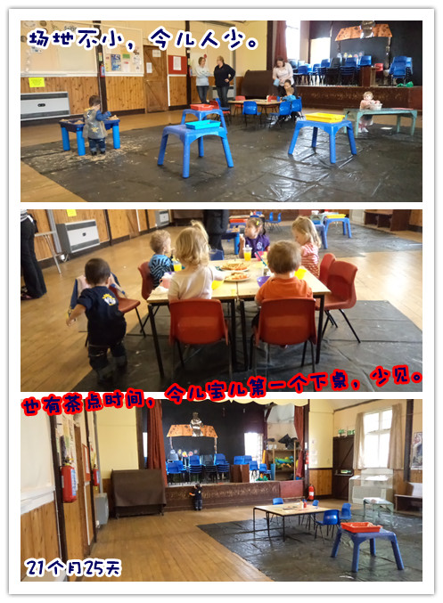 周三,我们还是去大牛家附近的一个Group玩,这个也是一个教堂办的,特别大、特别好。光室内活动场所就3个,还有一个大花园,随处都有桌椅,家长们可以坐在那里看孩子们玩,喝茶聊天。这里的茶点也很棒,种类多、味道美。就是这里的小孩子特别多,所以,也像B村一样,茶点时间就不聚集小朋友们围坐一桌了,都是“自由行”。这里稍贵,每次2镑(人民币20元)。因为这里很好,所以很“火”,人满为患,我们知道得晚了,就去玩了一次,被纳入Waiting