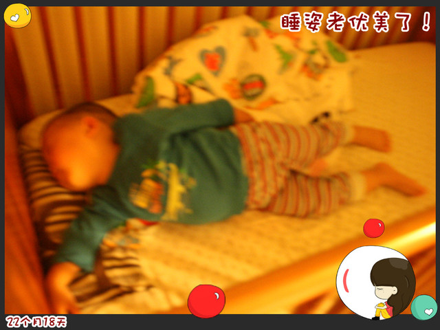 溜宝现在睡觉状况太美好了!晚上自己张罗着“睡觉”,然后我搂着他在地上喝完奶,他就闭着眼睛,仰个大脑袋,嘟噜个大脸蛋子进入睡眠状态了。我就给他抱上小床,边亲吧一阵子边说些话,溜宝就闭着眼睛微笑着享受着,然后躺到自己的小床上,“拜拜”“午啊(晚安)”“耐耐”一系列,完了就安静地睡着了。有时,把他放上小床后,我和他爸还想在他这屋地上躺一会儿再下楼,可溜宝不让,说:“走、走。”硬是把我俩给赶走了。