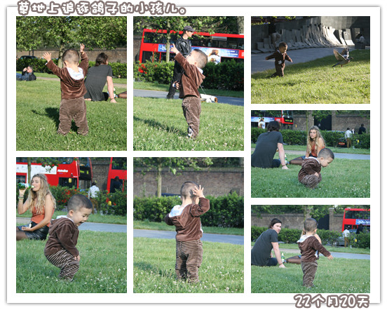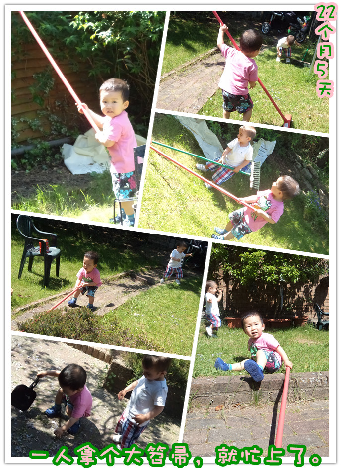 不知道为什么,溜宝打一岁半从国内回来后,就不敢荡秋千了,以前很喜欢荡的。现在给他放上去,吓得直哆嗦,大喊“怕”,然后急切地、交替地向我、向溜爸伸胳膊,喊“抱”,见我和爸爸都无动于衷,只是语言安慰,又更明确地指示——把食指使劲儿地指向下边:“地!”我给他抱出来,他立刻喜笑颜开!笑得“嘿嘿”的,就像每天早上我给他从他屋抱到我们屋喝奶睡回笼觉一样开心。