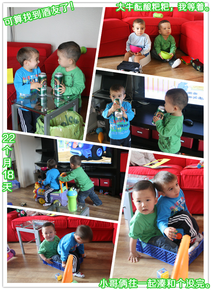 溜宝吃完了一小盒葡萄干,然后大牛就拿着盒子玩,还把盒子往嘴里送,溜宝就急了,告诉大牛:“别吃,别吃。”。溜宝用“下地”这个词的频率很高,但我发现,他理解的“下地”还不是很准确。比如早上让我从床上“下地”,这对;从车上出来要“下地”,这也勉强对;我捧着电脑,他指示我往沙发上放,用的也是“下地”,看来他理解的“下地”还有“放下”的意思,就是往下弄东西或者人,都叫“下地”。