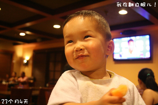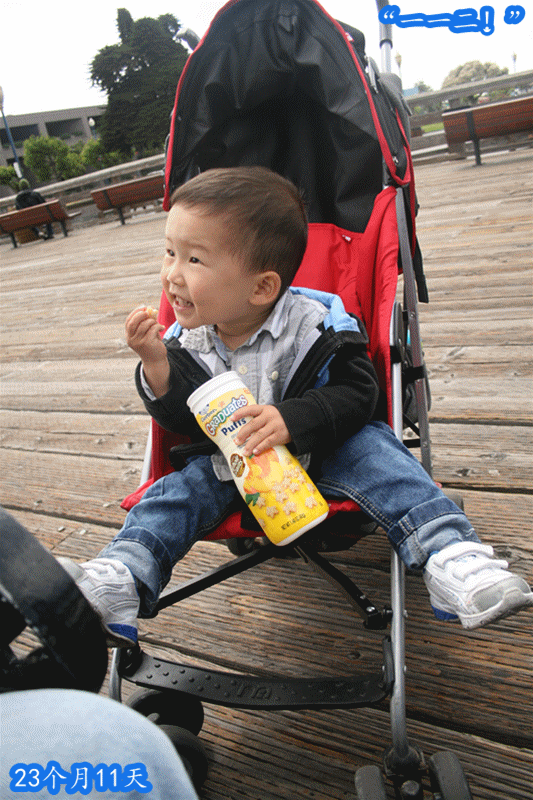 有一天才逗呢,在旧金山,傍晚我们在唐人街找地儿吃饭,溜宝就一直在推车上老老实实地坐着,一声不吭。后来可能实在饿急眼了,冲我大喊:“妈妈,给,妈妈,丫丫(好吃的),妈妈,给呀,给呀,给呀……”那家伙,叫唤得才邪乎呢!我们就赶紧随便进一个馆子,落座、点餐、吃上。溜宝狼吞虎咽,菜还没上来呢,自己连用勺带上手抓,吃进去了一小碗白米饭。看样子真是饿坏了,那些天头一次见他这么吃饭。
