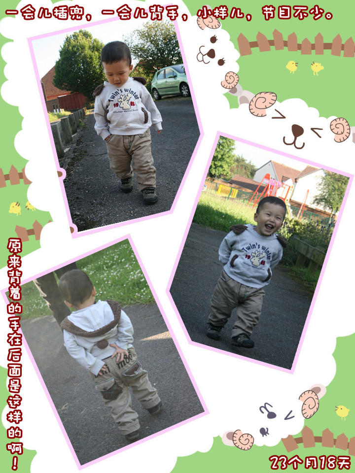 溜宝愿意走是愿意走,但是他走得慢啊,边走边玩啊,看啥都新鲜啊,每一毫厘风景都不愿错过啊!你浑身是劲儿想抱他他都不让(领着更不行),你把推车铺得舒舒服服的想让他坐他都不坐,真是急人啊!我和他爹,我推车,他爹抓他,他爹推车,我抓他,10分钟的路一般都照半小时走去了。