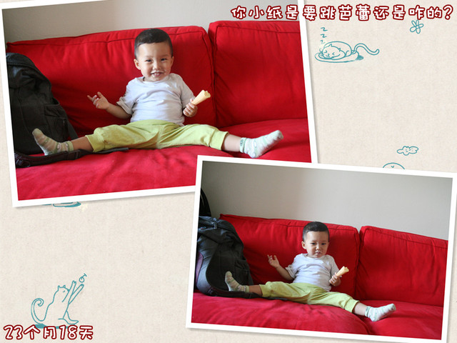 溜宝现在对于一些事情经常大喊:“不要、不要,No、no!”非常强硬。书上说这是2岁的小孩儿自主意识形成的体现,不要太加限制他。我是觉得这段时间溜宝的性情发生了很大的变化,是一个十足倔强的小男生。