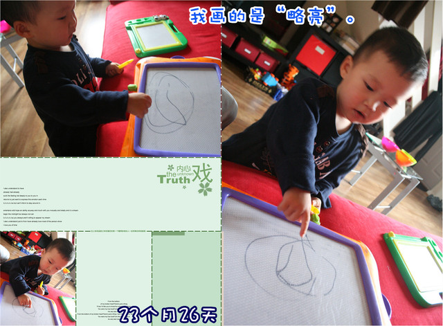 我给他在画板上画画,画一个他说一个是啥,说得都很对,就连只是一个直角拐弯形状的袜子他都能猜到。后来我画了一个锅,溜宝一指说:“烫。”哈哈,都对,看看小孩儿的思维,多有意思。