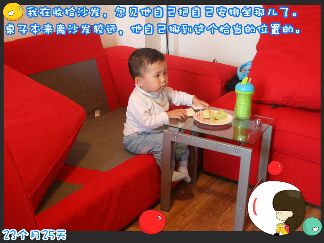 我给他剥橘子,他张罗着用碗接着吃,一个劲儿地指着碗架说“崴、崴”。吃完了又准确无误地说了一个:“吃没。”还抠冰箱门说:“吃灵,吃灵。”就是要吃冰淇淋。“果果,果果”就是要吃苹果;“那莓,那莓”就是要吃草莓;“家蕉,家蕉”就是要吃香蕉;“葡,葡”就是要吃葡萄,“桃、桃”就是要吃樱桃或者桃。“尿尿”说成“那尿”,“包包”说成“八包”,管“电脑”叫“泥脑”。