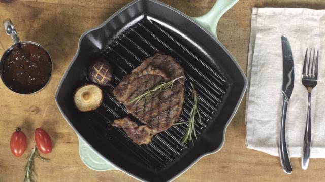 3 牛排锅上火,大火加热约4分钟,待牛排锅温度升上来后,将腌好的牛排放入锅中。